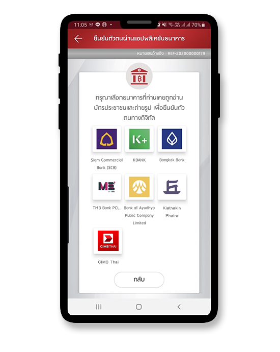 12. ทำการเลือกธนาคารที่ท่านเคยทำการยืนยันตัวตนและมีแอปพลิเคชันในมือถือ เพื่อทำการยืนยันตัวตนและให้ความยินยอมเปิดเผยข้อมูลส่วนบุคคล