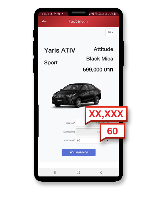 4. กรอกเงินดาวน์ เลือกจำนวนงวด กด“คำนวนค่างวด” ต้องการแก้ไข กด จากนั้นกด “